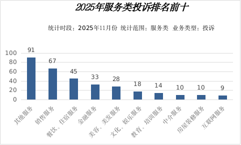 2025年11月份,全市服务类投诉排名前三位的依次为:其他服务类91件;销售服务类67件;餐饮和住宿服务类45件。详见下图: