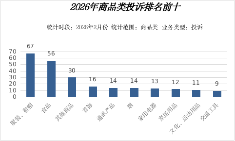2026年2月份,全市商品类投诉排名前三位的依次为:服装、鞋帽类67件;一般食品类56件;其他商品类30件。详见下图: