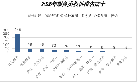 2026年2月份,全市服务类投诉排名前三位的依次为:其他服务类246件;销售类49件;餐饮、住宿服务类48件。详见下图:
